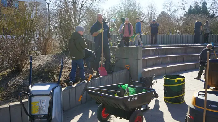 Bei strahlendem Sonnenschein und mit vielen fleißigen Helferinnen und Helfern wurde anschließend tatkräftig gearbeitet. Blumen wurden gepflanzt, Büsche beschnitten, Gehwege gefegt, Erde aufgefüllt und Löcher ausgehoben – jede helfende Hand zählte. Dank der engagierten Beteiligung zeigt sich unser Schulgelände nun in neuem Glanz.