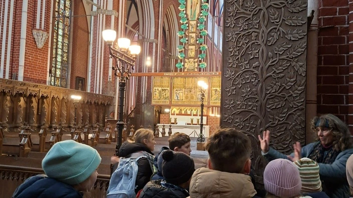 Zum dritten Mal feierten wir mit unseren Grundschulkindern den kleinen Kirchentag. Am Buß- und Bettag machten sich 190 Kinder gemeinsam mit ihren Lehrerinnen, Erzieherinnen und Erziehern auf den Weg, um die Kirchen der Umgebung zu besuchen. In Rostock erkundeten die Kinder die Johanniskirche, die Heiligen Geist Kirche, die Marienkirche und die Petrikirche. Sogar nach Schwaan und Doberan führte der Kleine Kirchentag die Kinder.