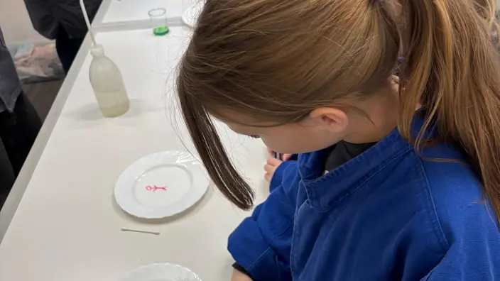 Im Zentrum des Projekts stehen fünf Stationen, an denen die jungen Besucher naturwissenschaftliche Phänomene unmittelbar erleben können. Für viele beginnt das Abenteuer schon beim Anziehen von Schutzkitteln und Schutzbrillen. Die Experimente wurden von den Neuntklässlern vorbereitet, organisiert und fachlich begleitet.